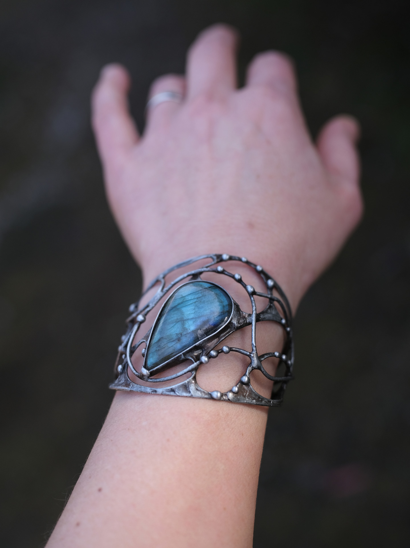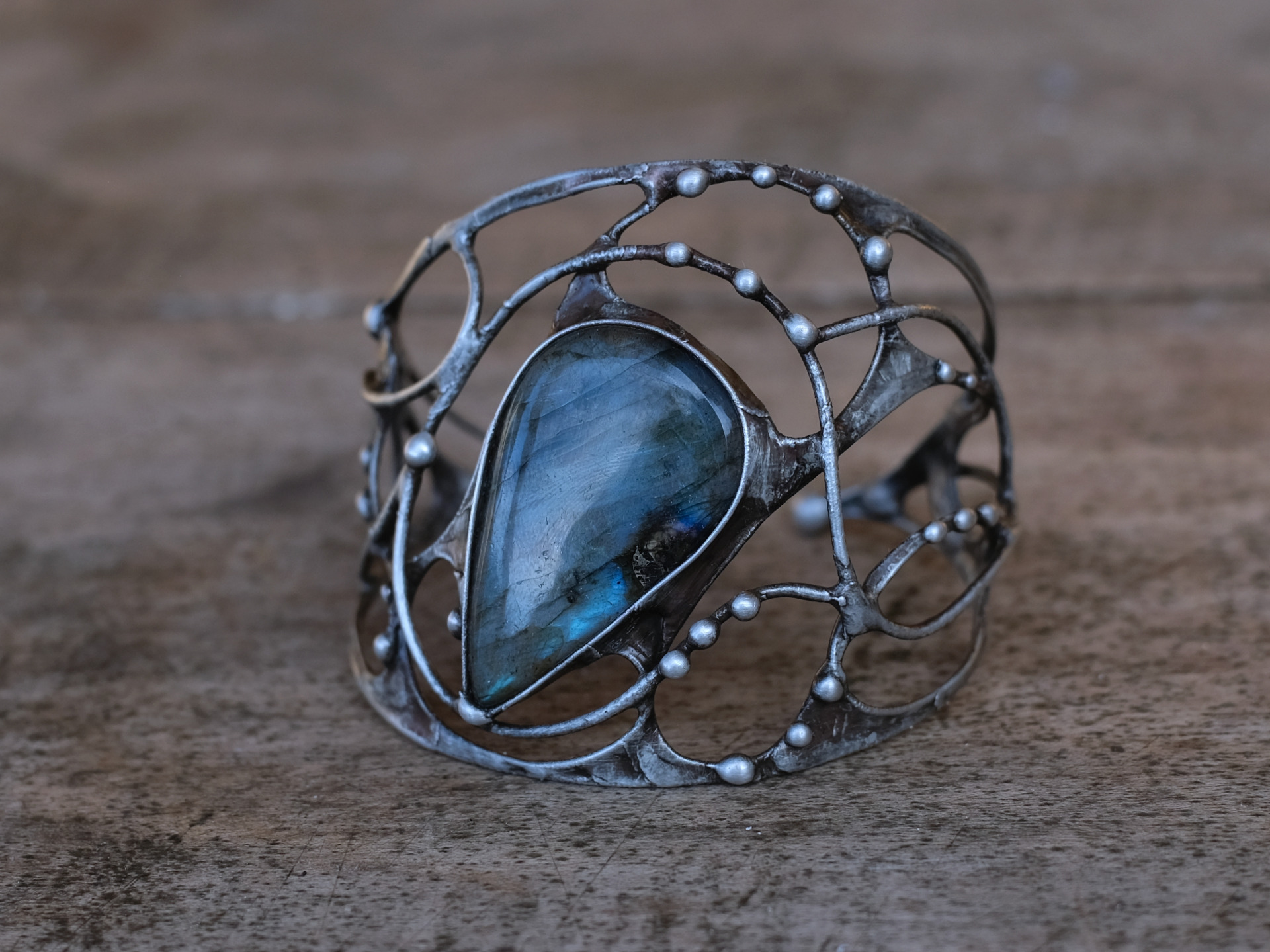 Masivní náramek s velkým a nádherně zbarveným labradoritem. Upravitelný na zápěstí. Náramky se nasazují hranou ruky, aby se co nejméně otevíraly.